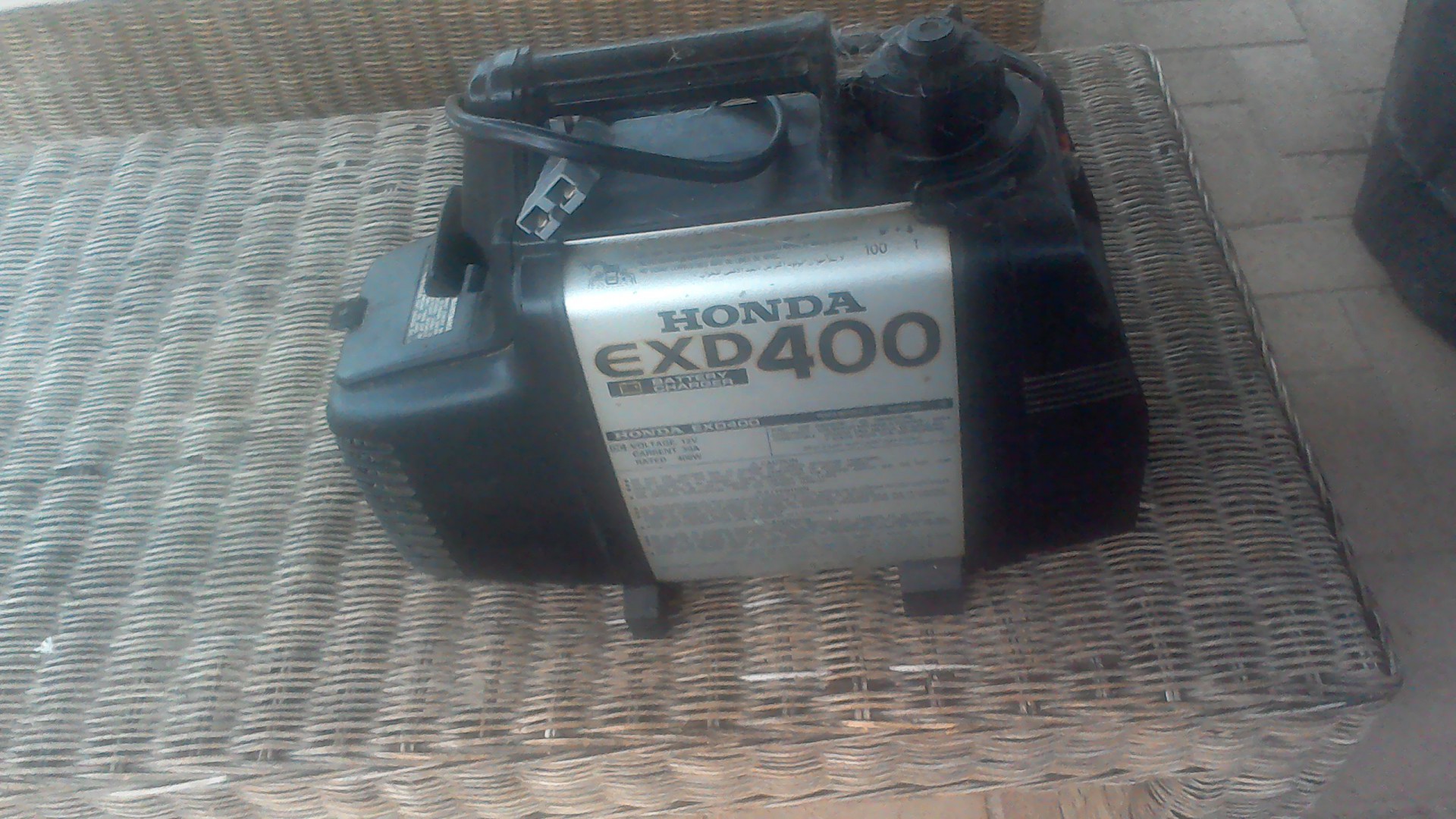 The EXD was a 50cc two stroke with an alternator built onto the end of the cranshaft and packaged inside a neat black/silver plastic box. The tank held 0.8 litres of premixed fuel which lasted for two hours, 100/1 mixture so pretty clean as far as dirty goes.. Smart it wasn't, I had to keep an eye on the voltmeter I stuck together for this purpose: a $10 multimeter with two banana clips soldered onto the flying leads of a cigarette lighter plug which plugged into any handy socket. Once the batteries reached 14.4 volts, the Honda had to be turned off, if not, two very well done batteries.