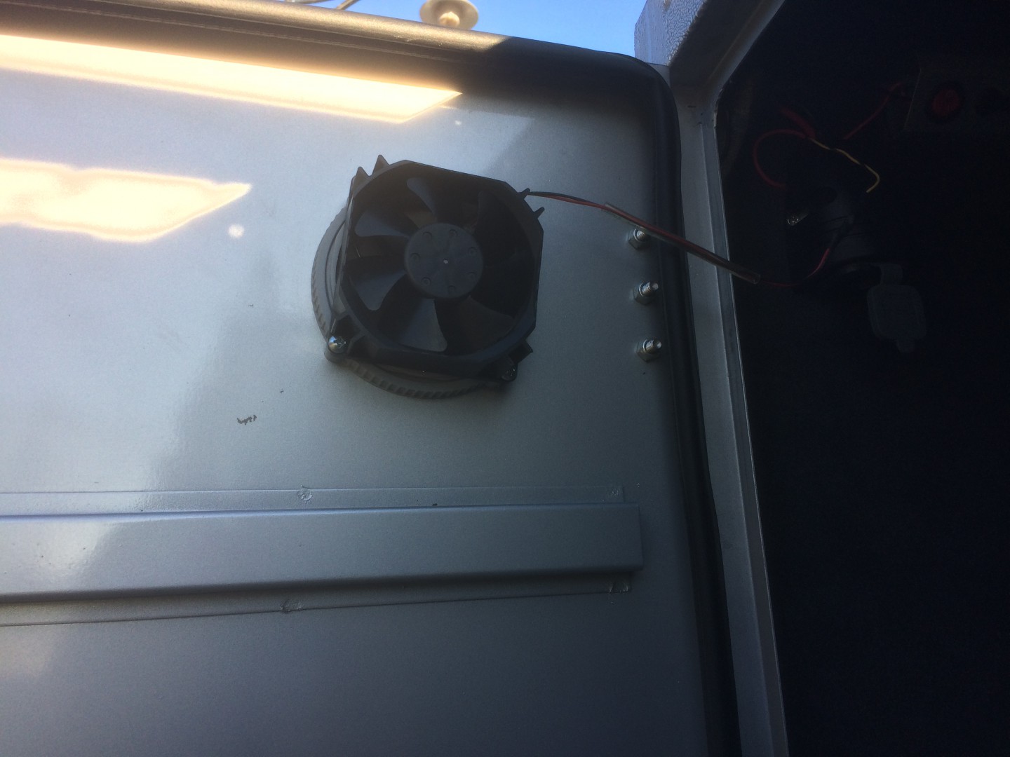 In the end, and easy fix. I plundered the fan out of an old PC case and the holes lined up perfectly. Wired it to the 12V supply so that it comes on when the fridge is on. Then I cut inlet holes on the door on the opposite side and installed a vent with a filter inside. Just a PC fan dust filter which comes in a cartridge and is replaceable. The airflow now is pretty good. I measured the internal temp with the 60L Engel running and it stays 1deg above ambient. Happy with that!