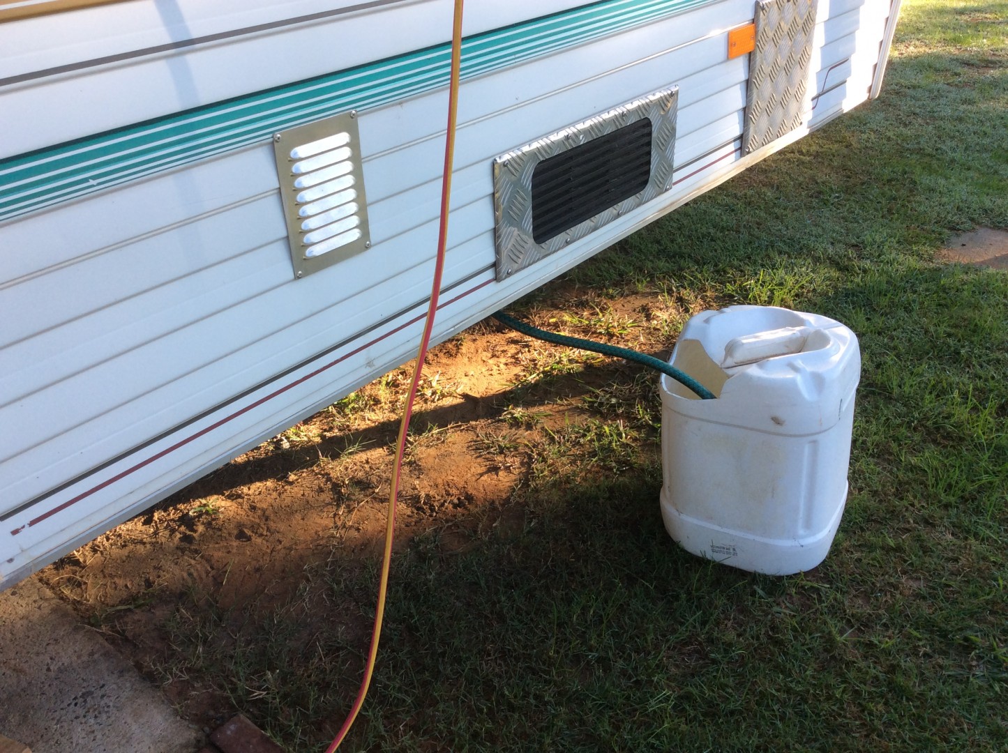 Found that canvas portable shower to be an excellent water harvesting implement when it rains and you are bush camped. Fit a snap fitting in place of the shower head, connect a water grade hose and let it feed into the tanks. Just make sure the awning is tilted towards the rear.