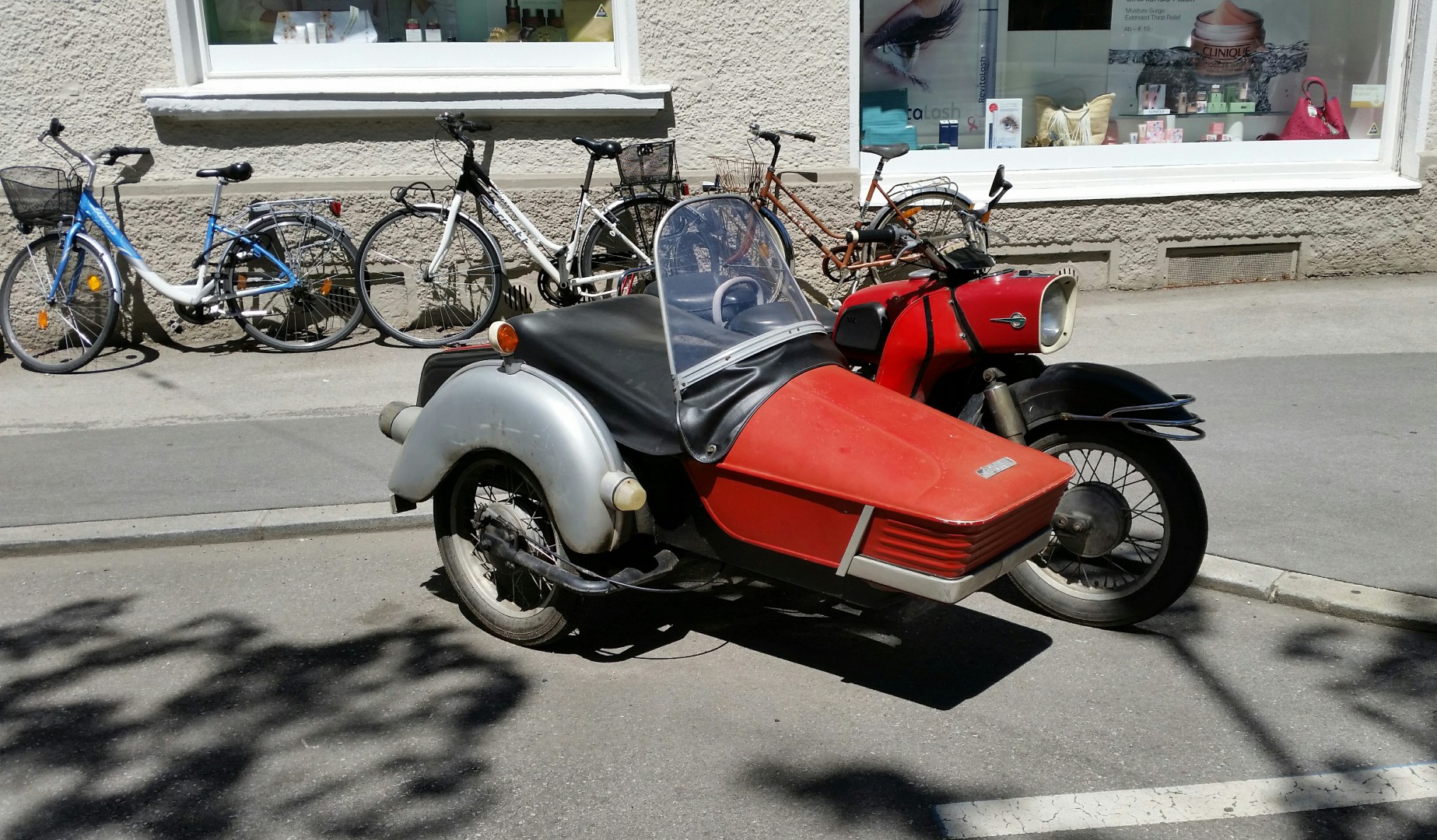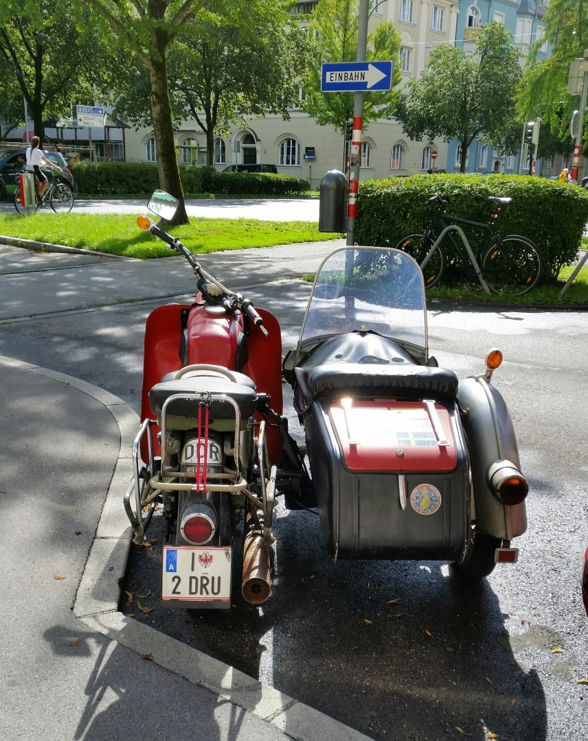 Saw this motorcycle with a side car oufit while out walking around Innsbruck, Austria, a daily rider, parked in the same spot most days but not parked there of a night.