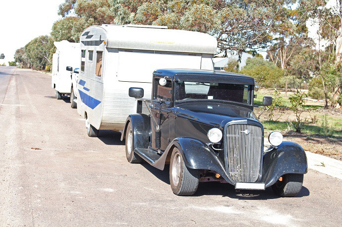 Several times I've seen an old FJ holden in original two tone green towing a similar era van also in the same colours. Very swish
