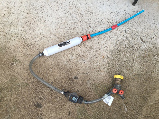 As we are having a couple of weeks away shortly I am making sure van is ready. I decided to measure and calibrate the water into the tanks again. I had to find enough connections to put the flow meter in line as well as have a tap to turn the water off without racing to the tap. I also needed to watch the indicator in the van. I made a pointy piece of stiff wire to hold the test switch, then set Eril's mobile up as a FB messenger video call to my mobile so I could watch the flow meter AND know when each of the indicator LEDs lit up. I did not want to use Facetime as that would use data!!