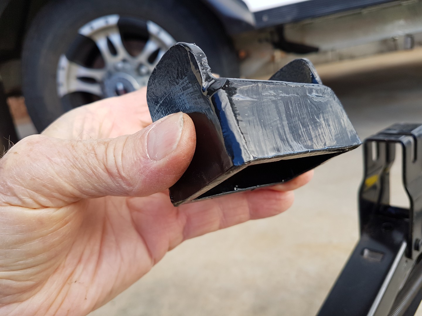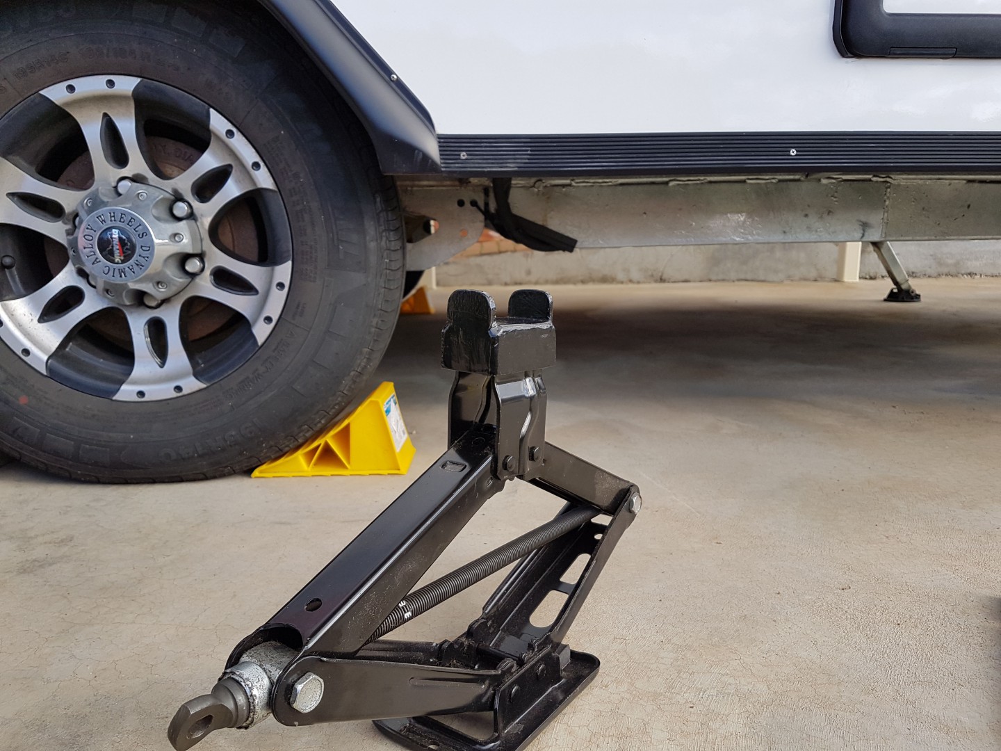 Hi all this might interest some who only want to carry one jack instead of two and are handy with metal work. I first checked out the suitability for my jack to the caravan. I checked that it was within the load rating to lift the van and that it went high enough to lift the van. The lifting point on my van is where the RHS drawbar comes close to the wheel. I made an adaptor to go ontop of my Santa Fe jack with two lugs to stop it from slipping off the RHS.