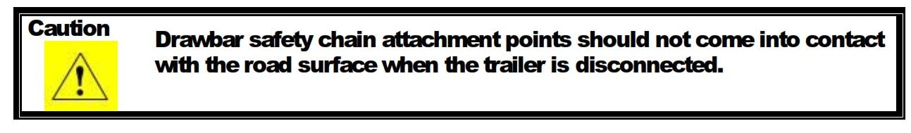 I can only assume (dangerous of me) that the 'caution' above is meant to indicate that, IF THE TRAILER/CARAVAN becomes detached from the tow vehicle the safety chains are to ensure the chain attachments, and drawbar inclusive of welded chain links, do not to come in contact with the road surface.
