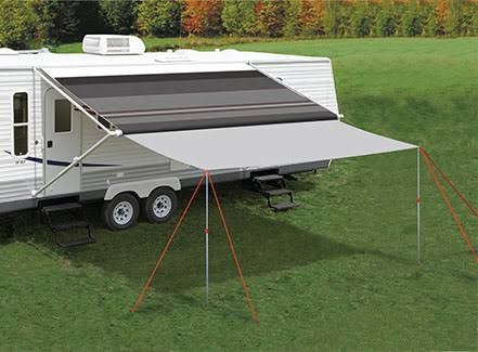 You could consider buying a tarp, to suit your needs. Then you will need to have one side cut off and then sew a suitable rope to this end so as to slip into the slot ( track) on the awning pole. Then purchase the necessary extension poles and ropes.