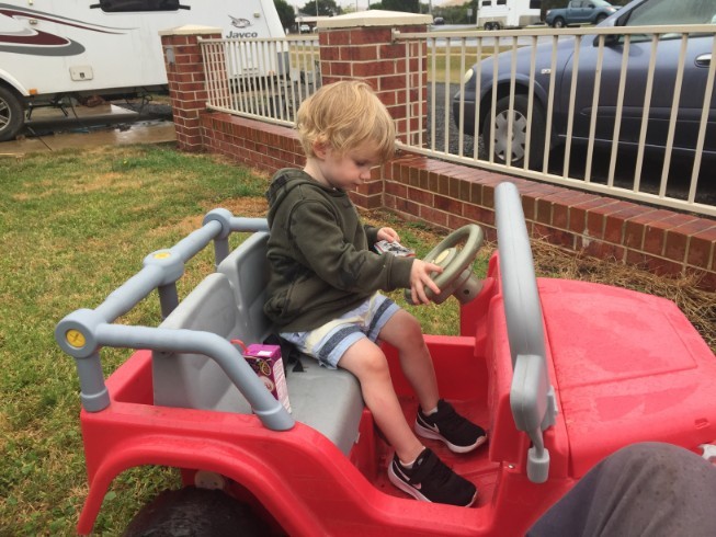 Nana made us a picnic arvo tea to put in the Jeeps front boot. With Edwin on the throttle and Pa walking alongside helping with steering we went 10 meters across the lawn to our picnic spot. Then Edwin and I sat in some gentle rain and had our picnic.