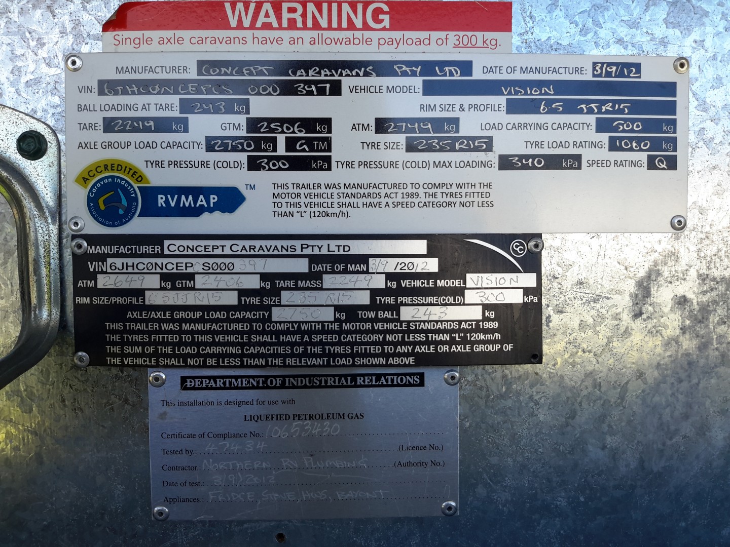 We approached Alan Grahams Caravans the orignal seller of the caravan for $165 they organised though Concept a Vin plate showing an extra 100 kgs. Things were looking better.