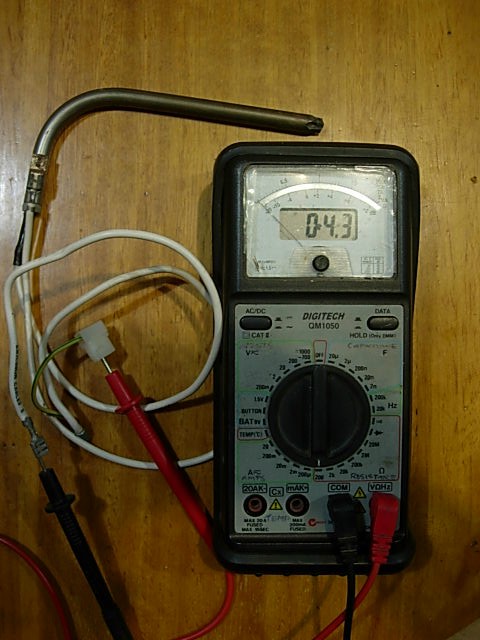 This is a 12V element as its all I have. But set your multimeter on Ohms & test across the element leads, you should get a reading (wont be as low as the 12V one in the picture) as your tesing a 240V element. Make sure the power is disconnected (plug removed) before doing this.