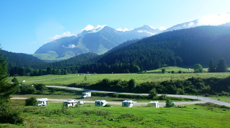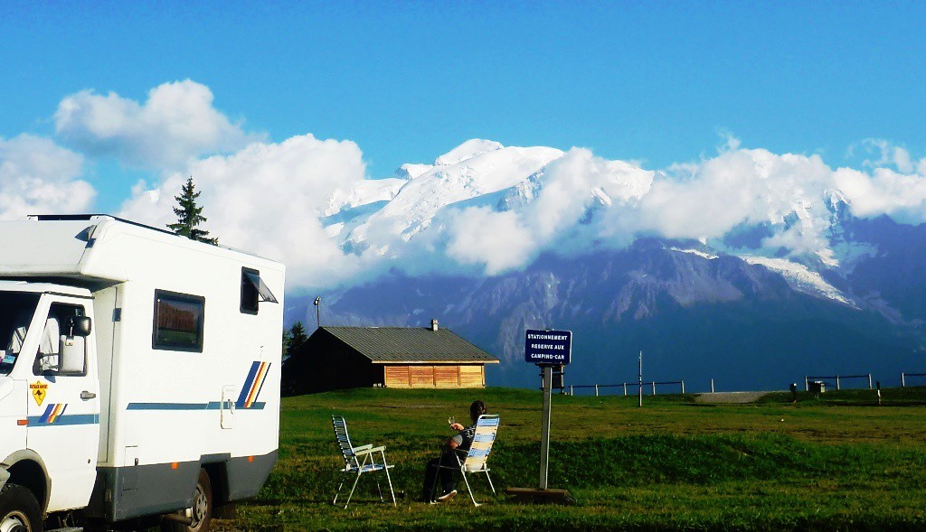 The sign on the first one says - Reserved for camping cars (which means motorhomes/campervans). Touring caravans are relatively rare. Mont Blanc in the background.