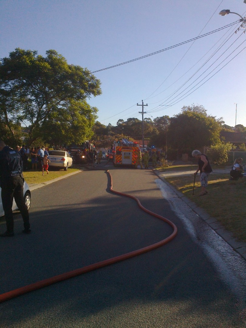 Leo, I agree, when I looked up where the fire stations are located, the C0ckburn one certainly has to cover a large area, and I can tell you we have many fire bugs continualy lighting fires in Kwinana, Rockingham and Munster, that brigade should be well practiced. Perhaps more little Flicks (the small land-cruiser appliance) dotted about would handle most jobs. In this case if the appliance had have arrived earlier, a little Flick would have done the job. Why the Rescue Tender arrived has me beat, the ambulance would have been more appropriate. I would say the Fire engines took 30 minutes plus to arrive, came the wrong way down the street meaning more turns, used a hydrant connection that was 100 meters away, instead of a closer and more servicable one. To top it off while a paramedic was tending to the burnt woman, they had to manhandle her on a blanket to another position to spray water on her, and I still never saw an ambulance. The woman and medic are just visible in the right most point in the photo, where another woman is standing.