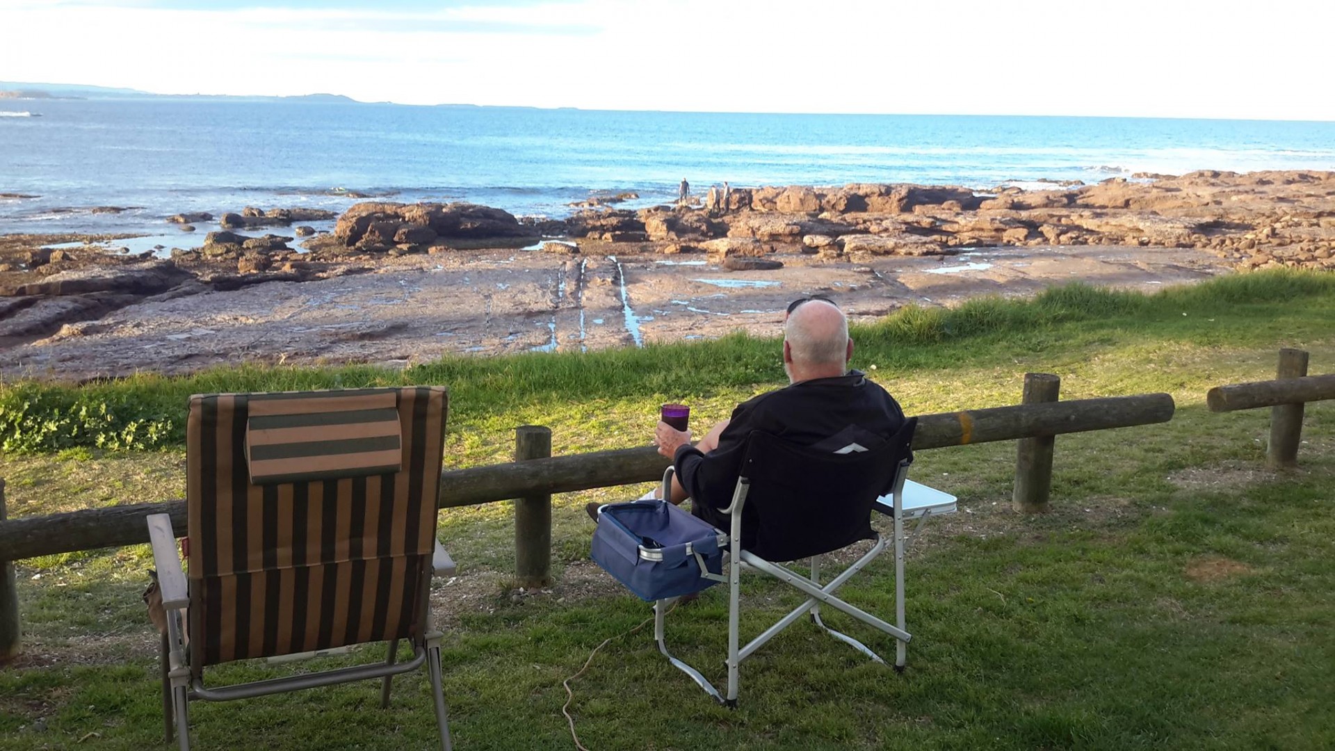 http://www.shellharbourtouristpark.com.au. Rocks directly in front. We had a spot two rows back but just took our chairs over to the edge. There were beachfront sites. To the left of the pic is a sandy beach. It was a fantastic relaxing spot.