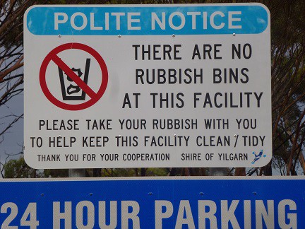 Stayed there last year, and while the sign is a bit 'in your face', it doesn't say anything not seen on signs at most council-run free camps. Maybe they could go the polite route like this sign at the 24-hour free camp in Southern Cross, WA, I spotted today.