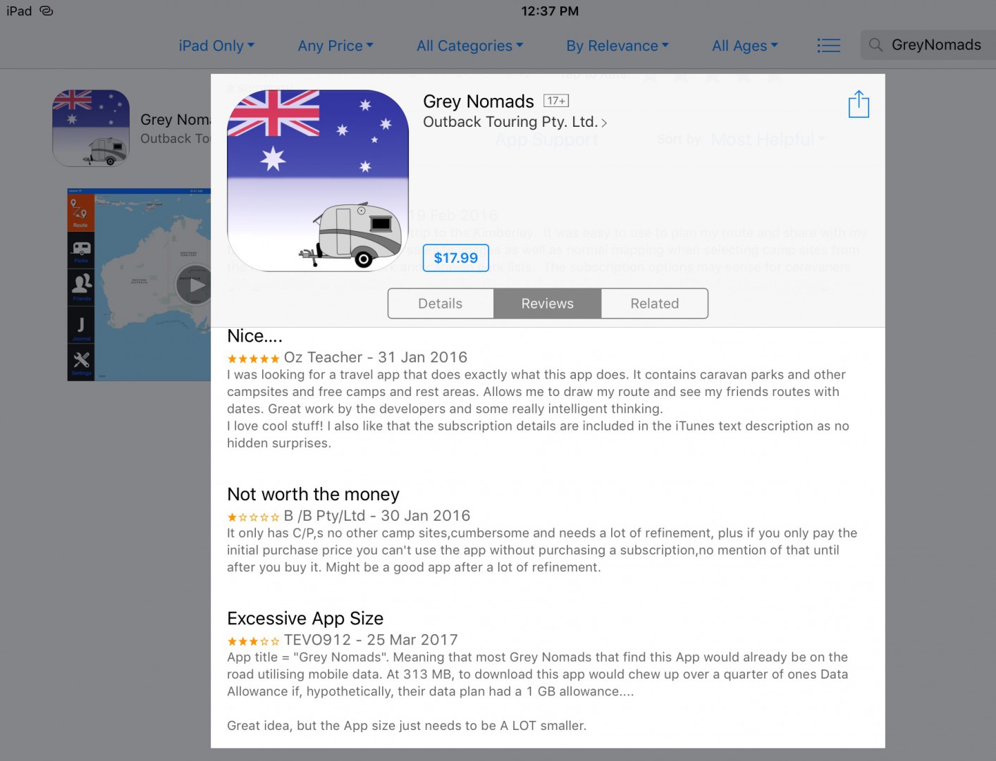 There is also a mob called Outback Touring Pty Ltd who have three apps, Grey Nomads, Caravan Australia and Offline Maps & Navigation Apps. Tied up with them is a facebook page "Grey Nomads." It also appears that the apps are for Apple products only.