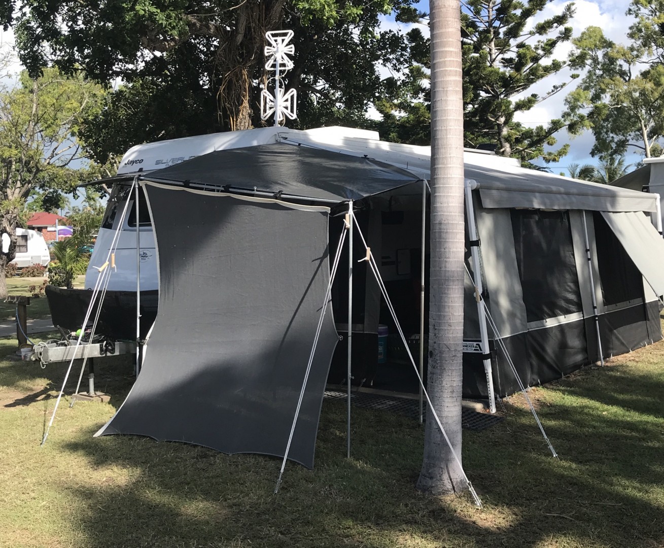 Our Annexe from Australia Wide arrived and was easy peasy to set up, all very straight forward. We also got the inflatable Captains Quarters for storage or when there is a need to use it as a sleeping quarters also. We are not on real even ground at the moment but it is serving its purpose anyway.