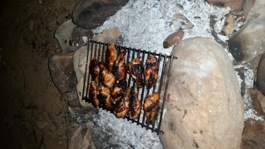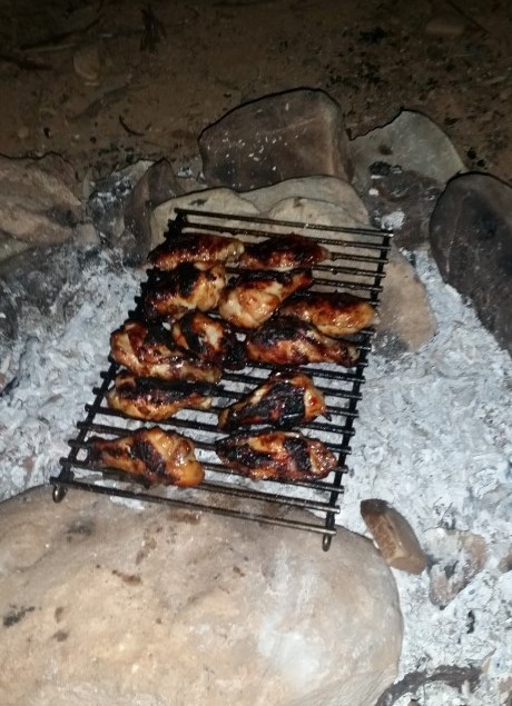 Marinated chicken wings cooking on coals in a creekbed.