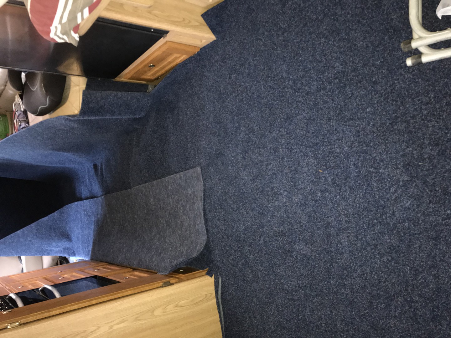 I've just fitted some marine carpet over original carpet and vinyl in ours . It sits down well over whole area. It's used as big mat No glue. Can easy be cleaned, bloomed or vacuumed .. One thing we likes about it . No chance of slipping . Which was an issue with previous vinyl ..