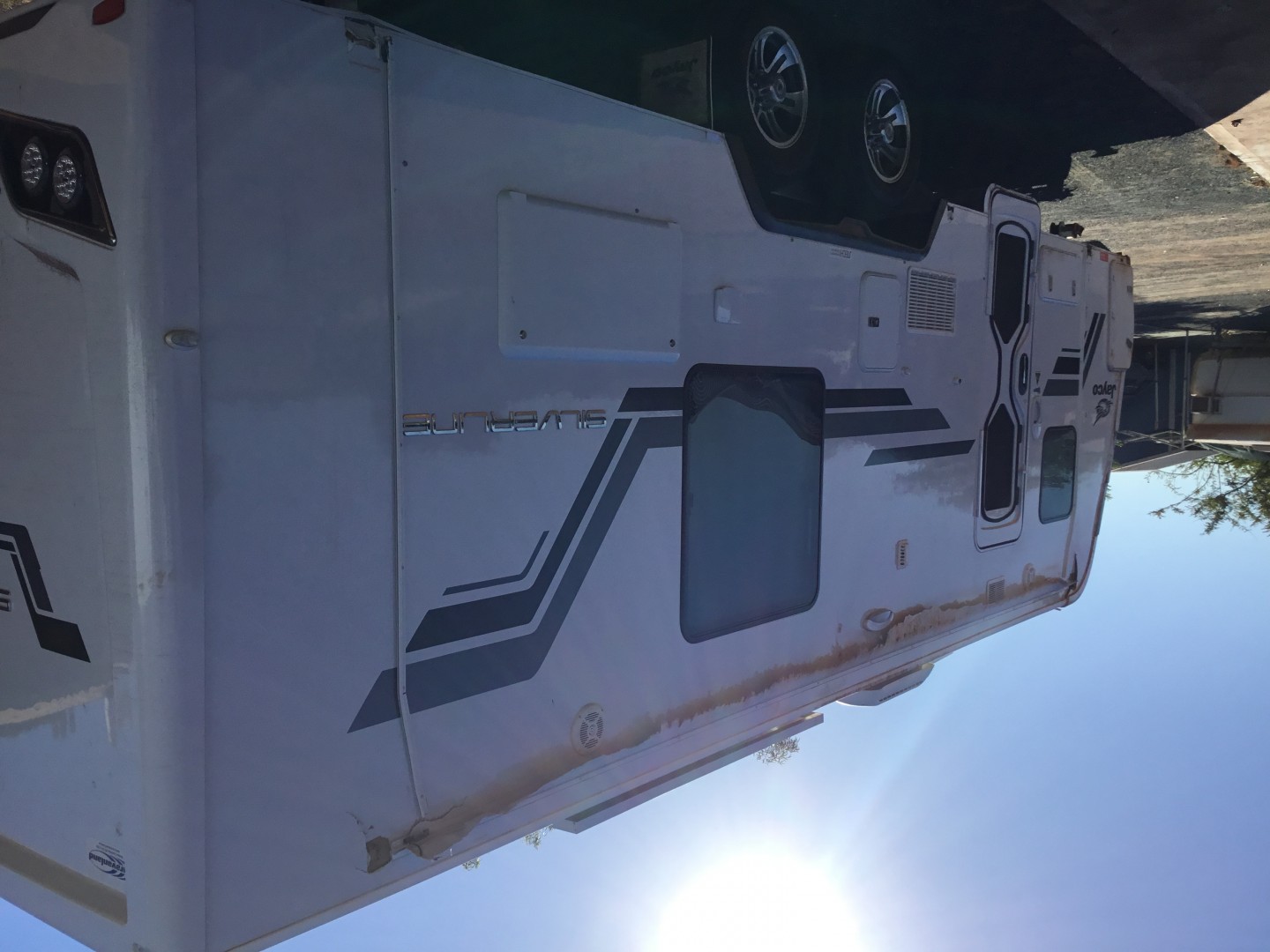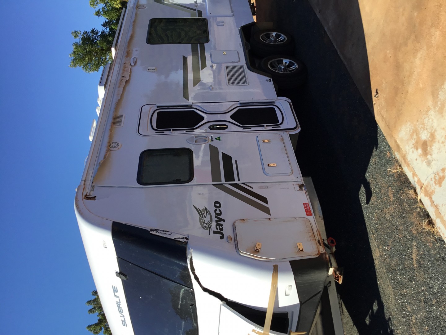 Interesting, to me it doesn't look like it rolled right over, no damage the solar panel or fridge vent. Was it just a side swipe, the awnings gone. Could the awning have come down while passing, I have made new Velcro ties for both posts, and the central post.