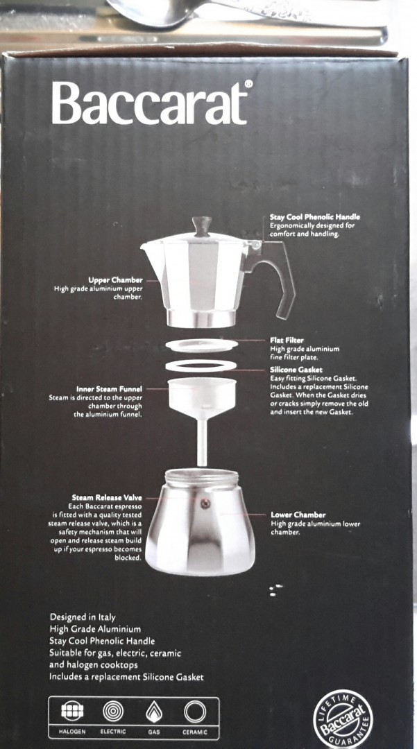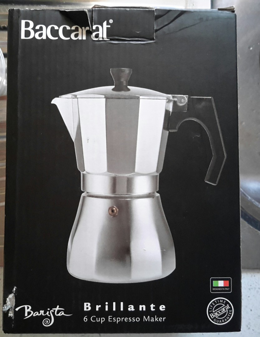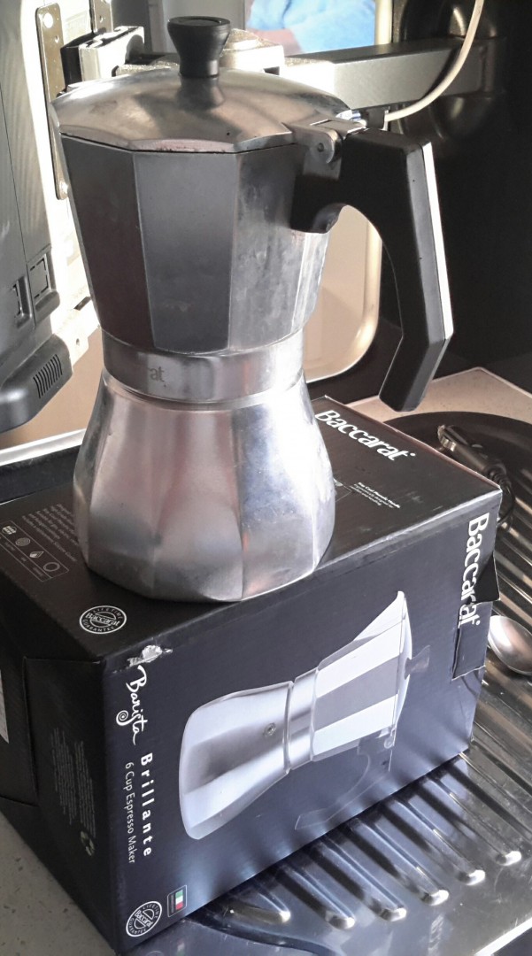 When we are at home we have a expensive coffee machine that blends the beans and all but far to heavy for the caravan and needs 240 volt power. We brought the one which is mid size, wholes 2 small cups of water, the carton reads 6 cup expresso. This is proving to be a winner, really bute coffee.