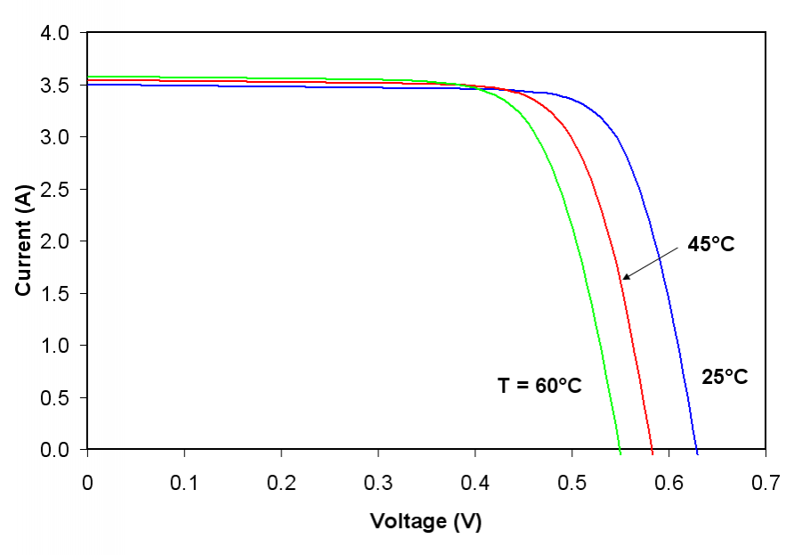 The picture below shows the effect of temperature on a cell. Note the suppression of voltage with the rise of temperature.