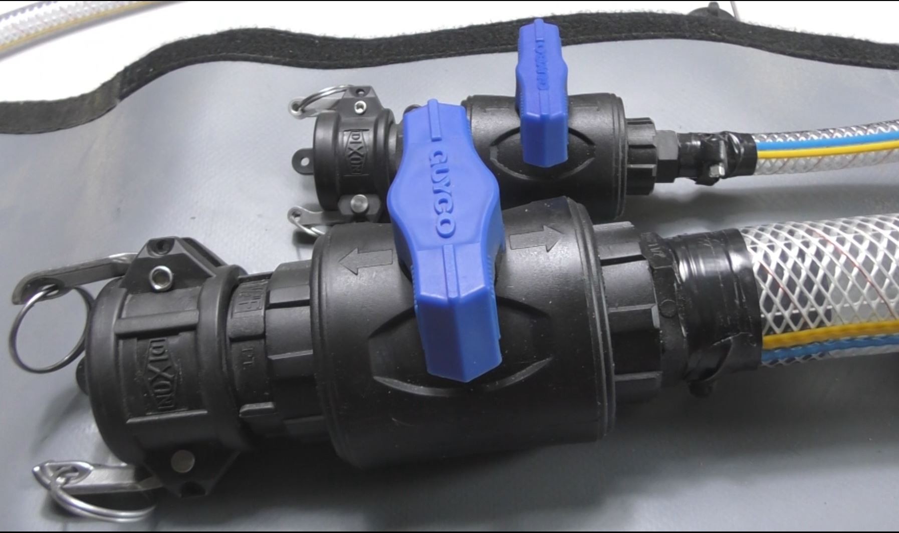 The tank itself has an inlet and outlet with the latter being the smaller of the 2 . All connections are fitted with cam lock type fittings which make for a positive join avoiding leaks