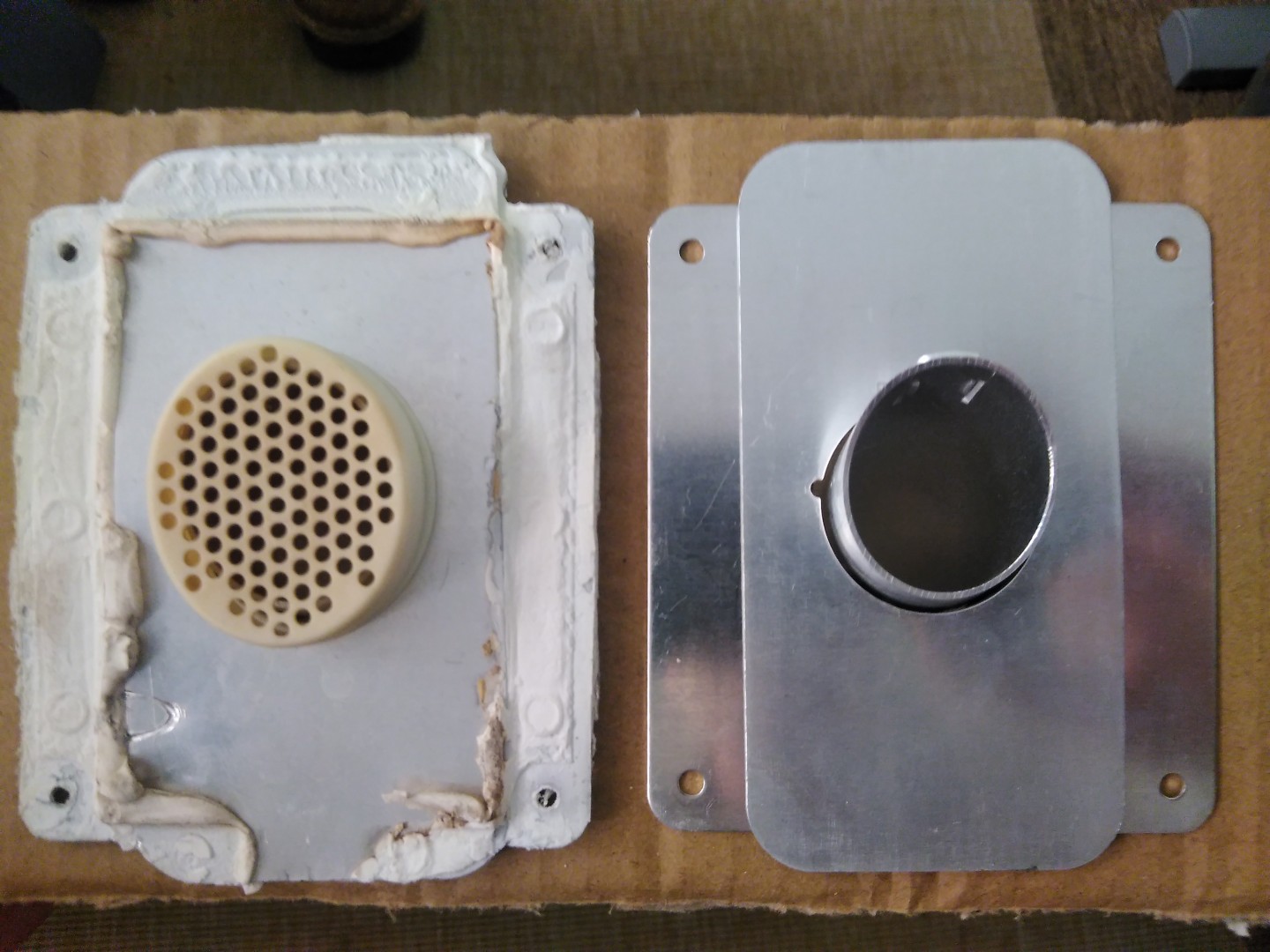 As you can see from picture below there are two ally plates. One is attached to the flue and obviously goes on the outside wall of the caravan, the other is larger and squarer and I don't know whether this goes on the inside wall or also on the outside? The original installation (from new) had it on the outside, sitting directly under the other plate, but I don't really see the point of this, and it means the plastic louvred cover doesn't sit flat.