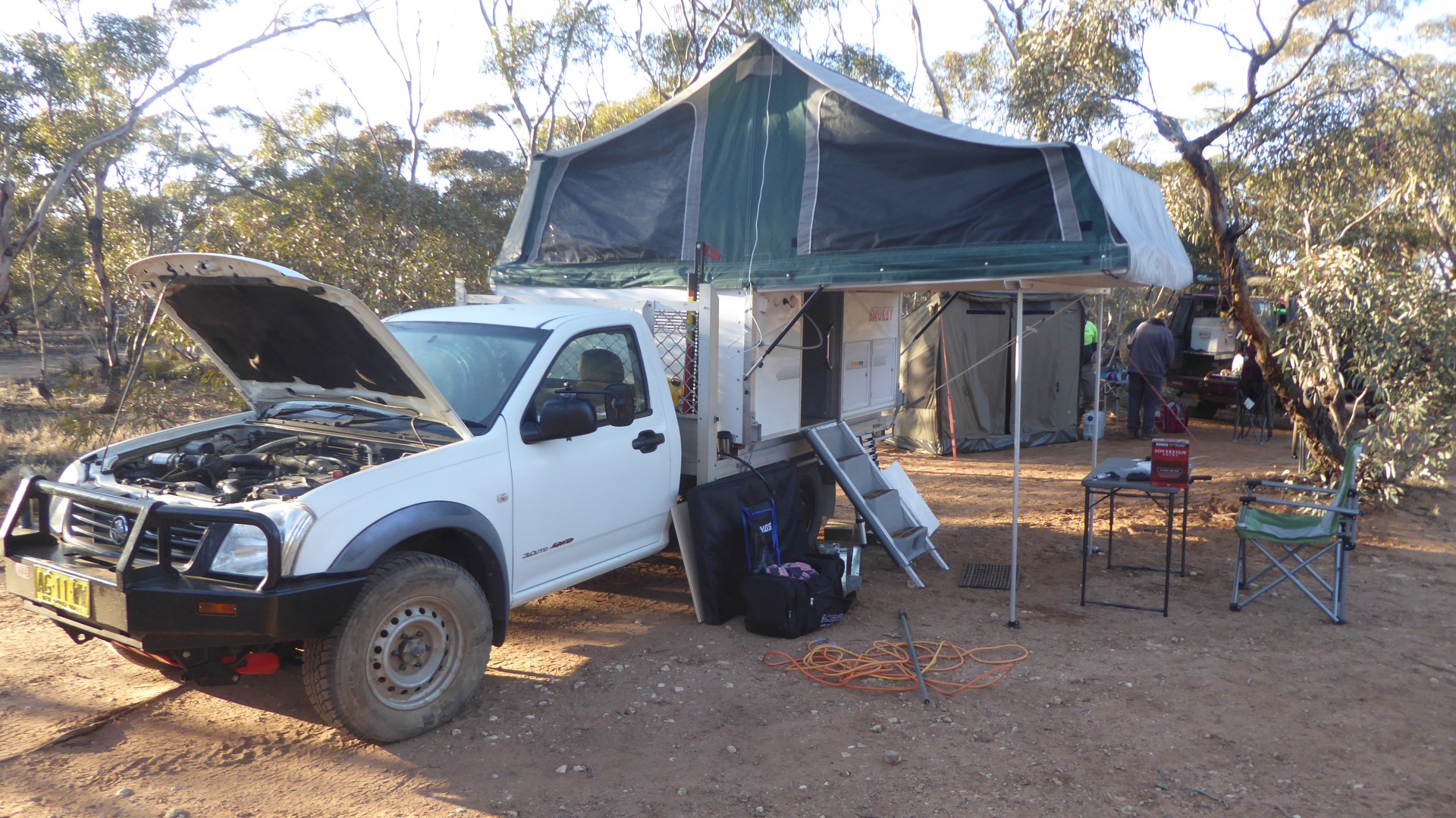 I guess it depends on what you want/need or aspire to. Ultimately, your rig must comply with your plans, budget and aspirations. I have a Trayon slide-on. It is more than I need, but was purchased to entice my wife into camping. She is a 5 star traveller and is accustomed to guided tours, full room service, chandeliers, marble floors and porters. Still, the compact folded size of the rig measures 2.2m x 1980x 1.2m. Unfolded and with the annexe, it is the equivalent of a 16 ft caravan! Two burner stove top with grill, 100l fridge/freezer, hot water mixer tap and sink, ample bench space, dinette table and queen sized bed. Additional luxuries are a (hot) shower, annexe and porta potti. 5 minutes to set up if still on the truck (for short stays) and another 10 min to jack it up off the tray to free the tug for exploring. The annexe fits neatly with a solid floor velcroed to the sides and is easily erected (10min?) for extended stays of a couple of nights. Totally waterproof! With power via 12v Redarc system, 240v, solar panels, gas cooking and diesel heating system for hot water and cabin heating, and 110 lt water tank, it is ideal for a couple of weeks of remote camping. Other advantages are less stress on the vehicle/driver by not towing, fuel reduction, access to tracks for 4x4 only (many National Parks restrict trailers/vans at their camp grounds and tracks), parking in normal car parking spaces, easy storage, and flexibility of configuration. The tug is a 2005 Rodeo single cab (3lt diesel, airbags and 60mm lift). Dry weight of the Trayon is about 400kg so plenty of leeway in the GVM to take advantage of the surprising amount of load space in the Trayon. I will generally be on blacktop, but want the ability to go off road to explore a number of remote and free camp sites. Having said all that, it is horses for courses. As I mentioned, not everyone wants that and prefer the more sedate touring. The Trayon comfort is nearly caravan style without the disadvantages (i.e. rego, maintenance, ferry fees, parking and storage problems). It suits me perfectly, but isn't everyone's cup of tea!