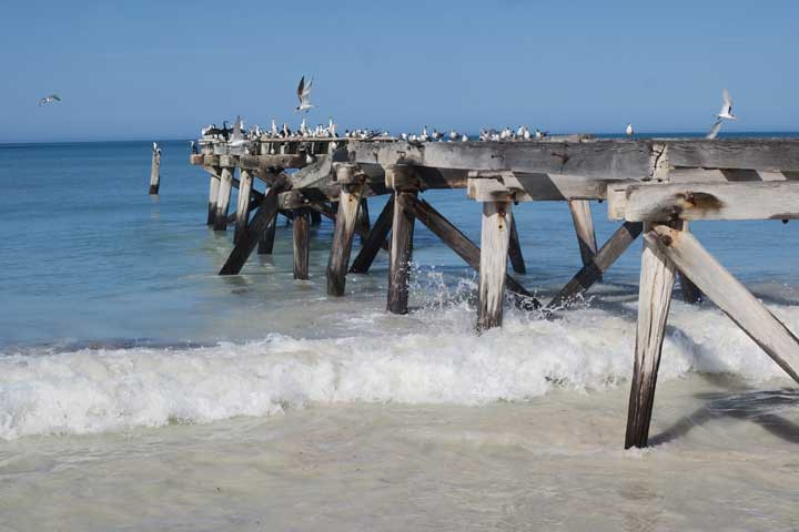 Thank you for your concern. I was careful, the photo was carefully cropped to look like one leg is using a sky hook! One also needs to be careful of holes in the ground out there & be in the car with lightning. Pretty scary place, but well worth the drive, we took our time & walked up some of the escapements, the trees up there looked like they belong in the snowy mountains (photo a little west of Eucla)! Golf course & old jetty near Eucla.