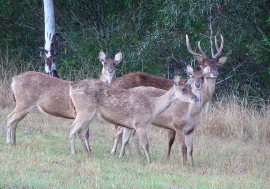 Most of the bigger ones are Sambar breed. Put a couple of those roo scarer whistles on the front of your car - about $7.30 at Autobarn or Repco. Really do work. Big stag jumped out from right hand side of bush onto middle of road and when he heard the ones mounted on my car he turned and leapt back into the bush on right hand side. You need to be doing between 40 and 90 for them to work. Too slow - don't generate enough wind going through. Too fast - and you're on top of them before they can get out of the way.
