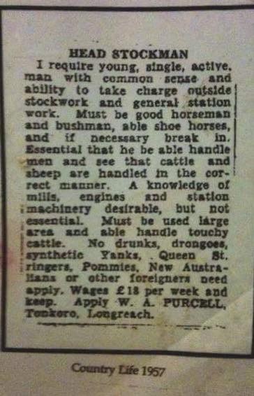 Don't think this 1957 advert would make the cut today.....wonder if he got the bloke he wanted...at least he didn't bar shielas from applying...providing they were male..Hoo Roo