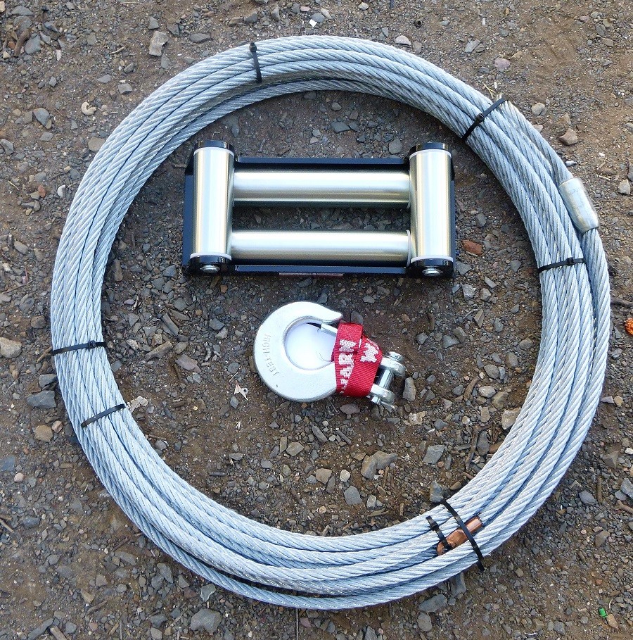 Winch roller fairlead, winch cable 11mm diameter x 30 metres plus hook. Never used.