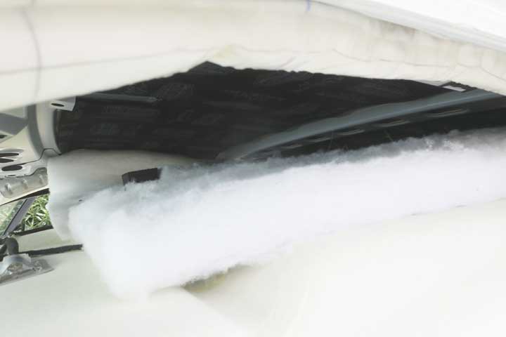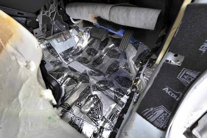 There is a hole roughly 5cm to the bare metal floor, so stuffed a lot of offcuts of pyramid foam in through the pairs of small holes through the carpet.