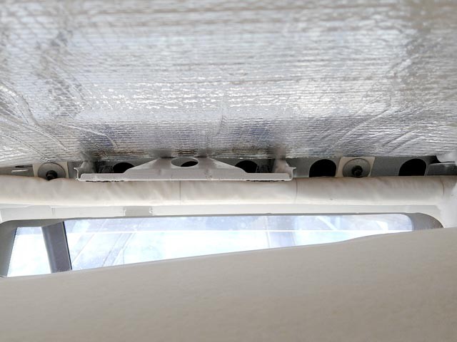 Ceiling centre to rear & inside structural beam. (Double up backing film long enough to push foam in then pull off tail of backing film. Save film from large pieces to reuse in these situations)