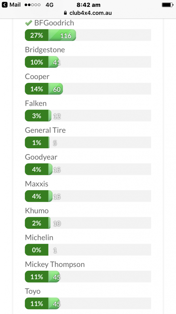 I may have said this before somewhere, Cooper and Mickey's if you are doing serious desert driving on regular basis. Spent 2 1/2 years in Warburton bashing landcruisers over rocky roads with no issues. Head office then said to only use the tyres that are OEM in this case 79lc had dunlops. One of the crew did two tyres in one short trip. The carcasses of the Mickey's were absolutely trashed from rock chipping and cuts, but we had no blowouts. Saw lots of blown out Bridgestones at the roadhouse. My personal LC was fitted with Mickey's also and no issues there also.