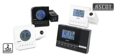 We've been using an Ascot projection clock (occasionally from Aldi) for the last six years - the clock sits on the sink surround and projects up on the roof - the clock is plug-packed into 240v - it cycles every three seconds to display time - temperature - time - etc repeatedly - nice to roll over in bed, look up and know what time it is and how cold it is !