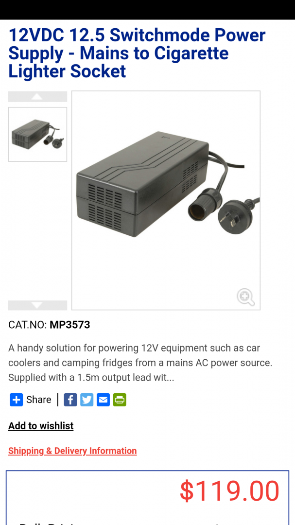 I then purchased a Jaycar Powertech 12 volt/12.5 amp Power Supply unit for $119 and it has worked great ever since on 240 volt mains.