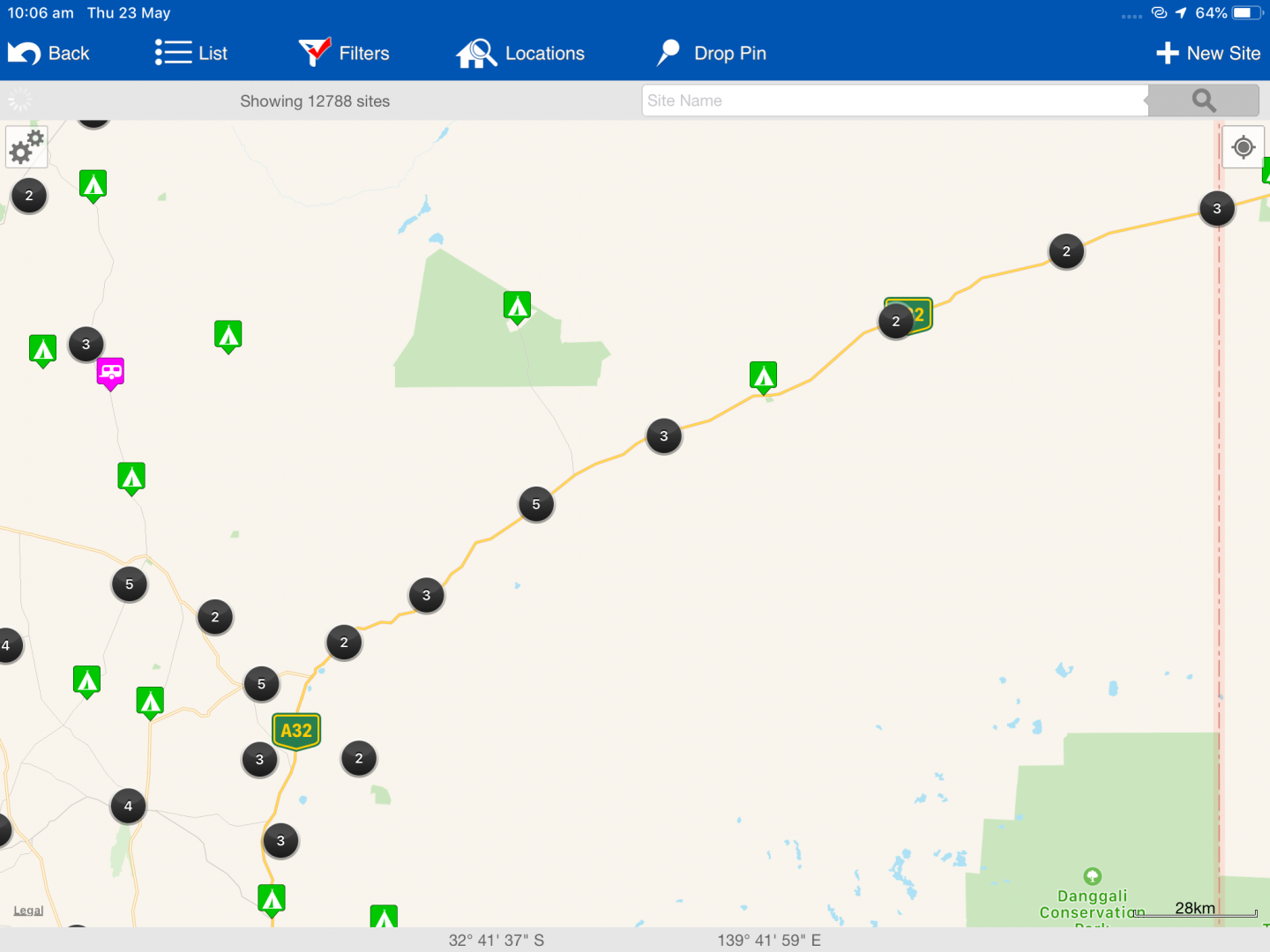 Wiki Camps list 26 from the border at NSW to Peterborough.