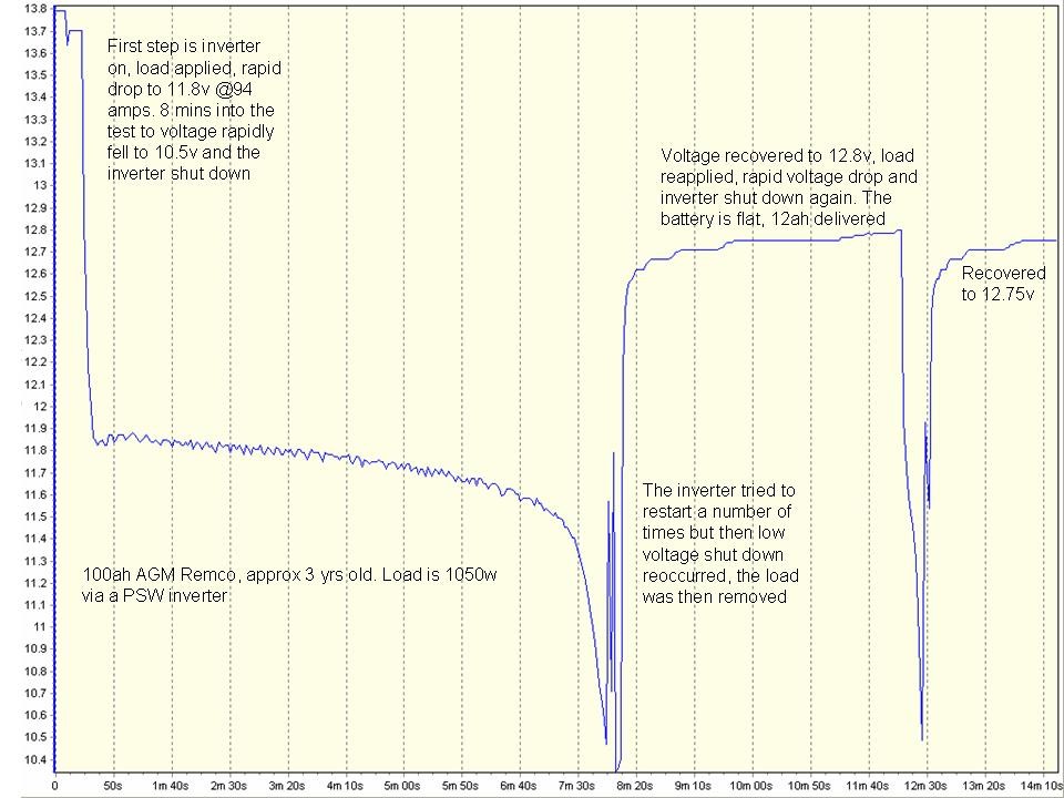 You are correct about the misunderstood bit Peter. Try applying the same load again to the AGM battery that dropped to 10v and it will drop to 10v again. Yes, it can supply a trickle current for a while, nothing like the remaining 50 ah capacity can be extracted though. I posted quite a few graphs showing this fact on the old CMCA forum about 8 yrs ago, all tests carried out using an inverter and coffee percolator, they were to show the difference between AGM batteries and LiFeP04 batteries of the same voltage. Here ya go, I found one of them