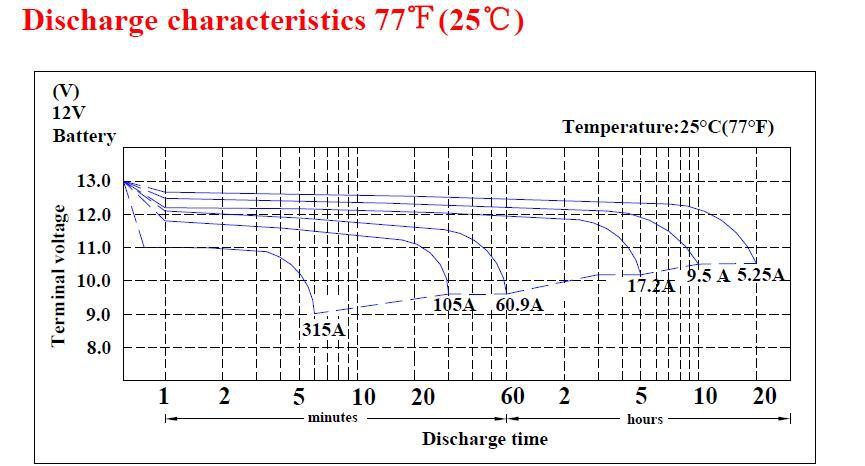 If you doubt that statement, here are the discharge charts from FullRiver for a 105Ah 12v battery. Follow the curves to the point they cross the 12v line and 60 minute line. Now follow that to see what discharge rate that line represents, 17.2 amps. 100amps / 17.2amps = 5.81. The curve does drop below the 12v line before it actually crosses the 60 min line, so 6 x 105Ah is a fairly realistic battery size requirement.