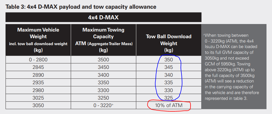 Hi Kevin....the generally accepted towball download,or towball weight,is 10% of ATM.However,you are now likely to get many different opinions and stories. Somewhere I read that,depending on the relative sizes of the van and the car,that figure can vary from 8% to 14%? However,if safety is of any concern,always the weight on the cars wheels should be at least 10% greater than the weight on the vans wheels. The Isuzu chart is correct,but if safety is of any concern,that car cannot tow 3500kg.If you were indeed silly enough to hook up to a 3500kg van,with 10% towball weight,the weight on the wheels of the van (3150kg) would be more than 10% greater than the weight on the cars wheels(2850kg) you would be an accident looking for a place to happen Cheers