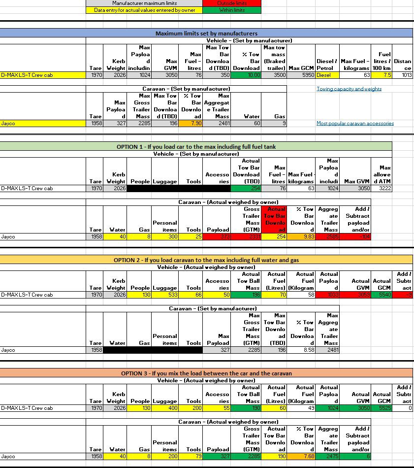This is still under development though you will see in the image below, there is a section for what the manufacturers say are their maximums. Then there are three sections for the owner of the vehicle and caravan to put in the actuals (Yellow cells). You will be able to either 1) load the tug to the max and see what is left for the van, 2) load the van to the max and see what is left for the tug, or 3) balance the load between tug and van.