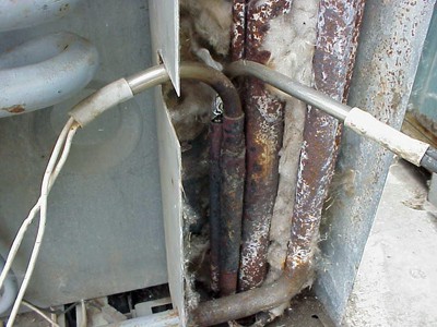 There's no technical reason that a 3-way fridge shouldn't work equally well on 12V DC as 240V AC. The principle of operation is a simple resistive electric heating element attached to the side of the boiler heating up the ammonia solution inside. In the pic on the left you can see the 'L' shaped AC and DC heating elements slotted into tubes welded onto the side of the boiler. The coloured cutaway makes it easier to see - the black is the boiler, the green the gas flue, and the red the pipe the electric element slots into. In the case of a dual voltage fridge there would be two of the red pipes, one for the DC element, and another for the AC element.