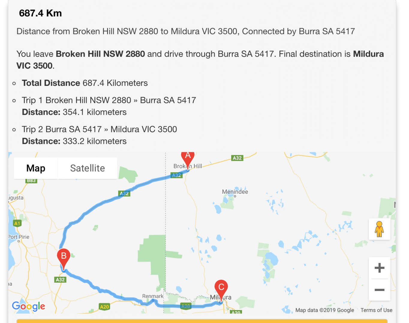 Unless you particularly need or want to go to Peterborough you would travel on the Barrier Highway from Broken Hill to Burra and then head across to the Murray and on to Mildura.