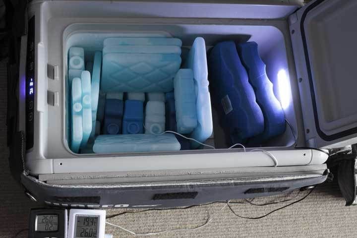 A torture test to see how long it takes to freeze 10.5 kg of ice bricks to -22C, lowest fridge setting. On previous tests thermometers I stuck in the fridge showed -24. Fridge cover & 2 thicknesses of 10mm foam. Aluminium heatsink to "butter" compartment.