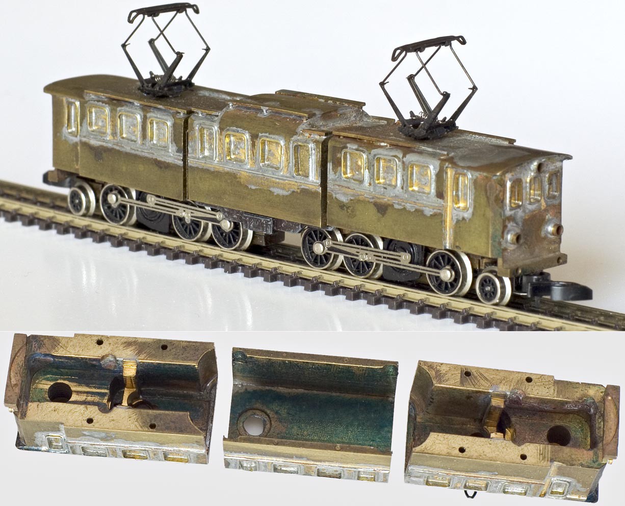 A brass locomotive I milled in one piece & then cut into its 3 sections.