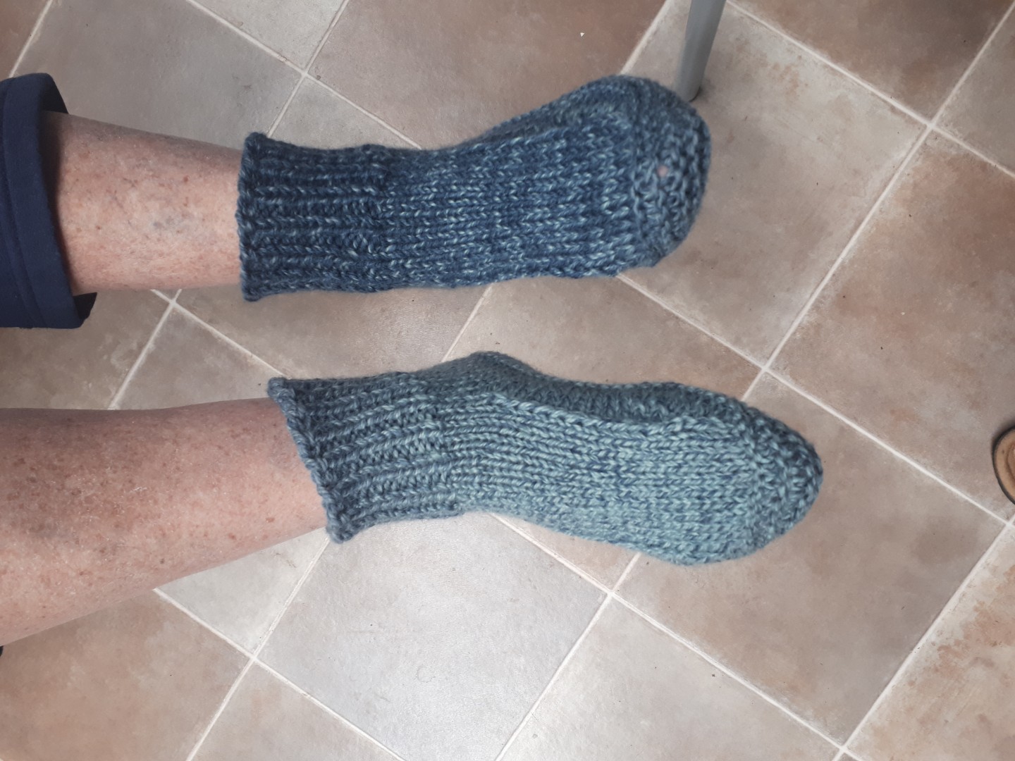 I knitted up some slipper socks for spouse and a friend from Bendigo bloom, 100% 8ply wool in slow colour change. Wool was held double and the colour changes in each ball provided an interesting effect - I think "unique" describes these, lol.