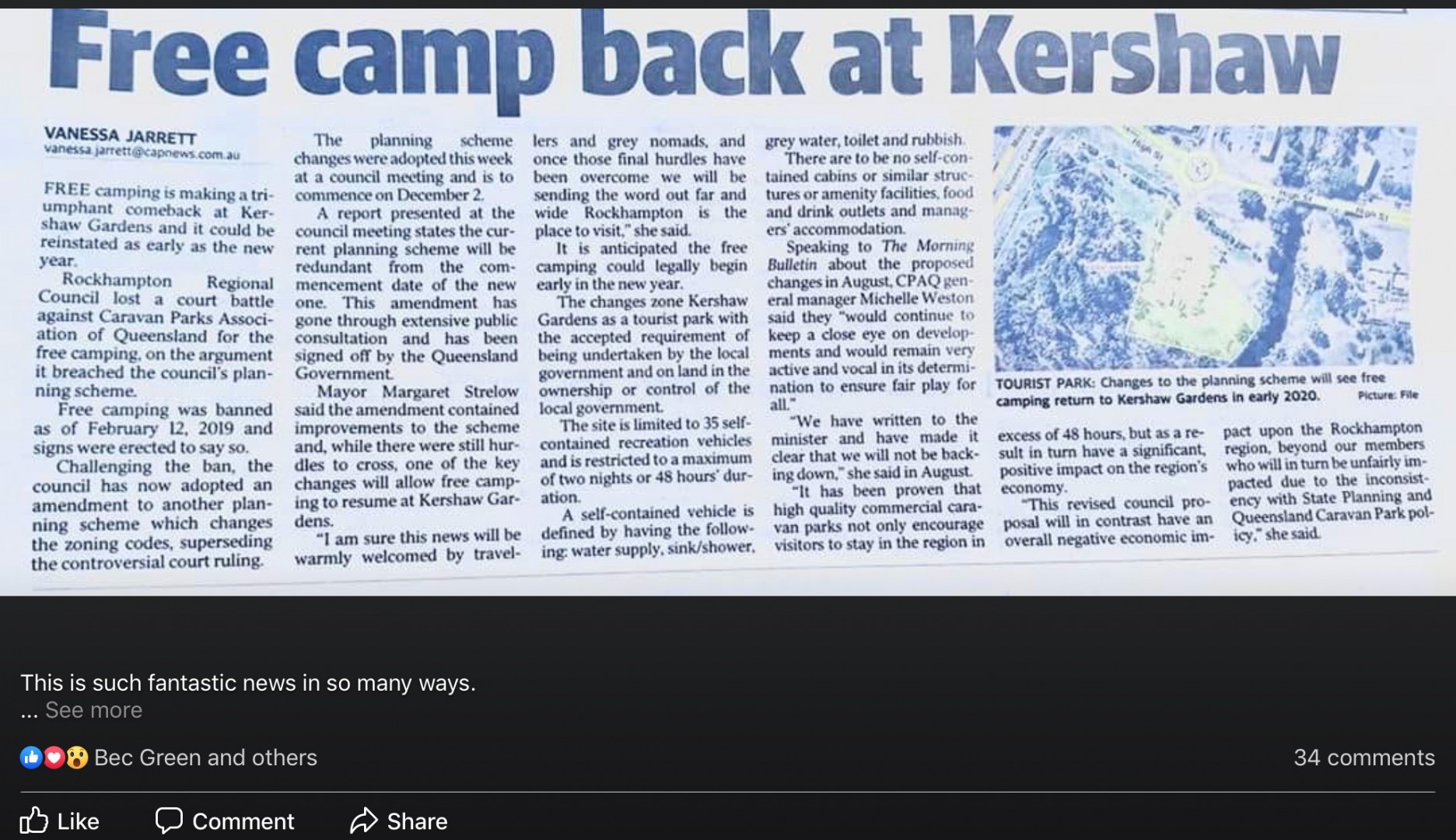I have no problem with free or low cost camping facilities even if they are almost in the Rockhampton CBD, but I do have a problem with a Council who wastes $200/300k of ratepayers money, especially when some of it was mine. If retaining the free camp facility at Kershaw Gardens were as simple as changing the Planning Scheme then why did they spend all that money fighting an unwinnable court case in the first instance. That money could have been used to assist drought affected farmers in the area, a much more useful cause.