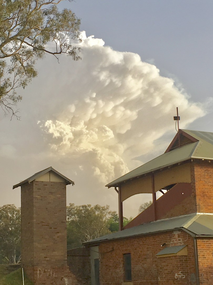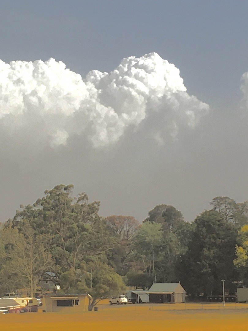 These are pictures of the "Pyro-Cumulus" cloud before it collapsed. Taken from where we are camped at the Moss Vale Show grounds. The pictures are taken by an evacuee also camped near us. The fun could be about to start again about 11pm when the hot winds turn and come from the south.