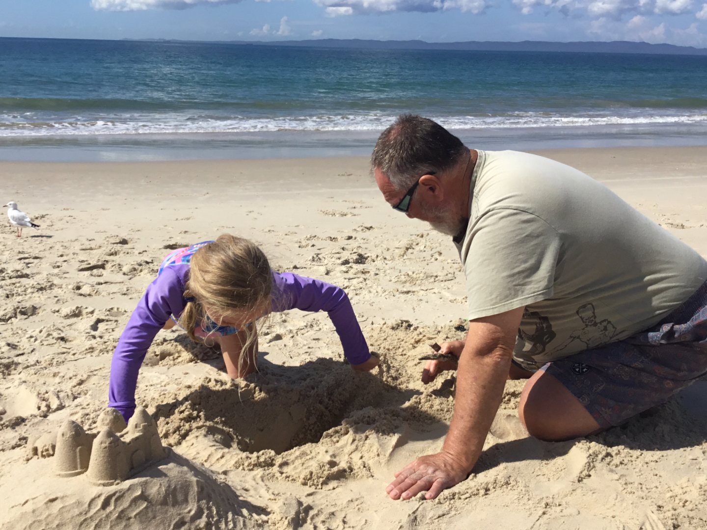 The grandies and myself enjoying the beach at sunset. Bribie island. A holiday spent building sand castles and enjoying each others company. Grandies frolicking and swimming in the surf with their boards while mum, grandad and i joyfully watch on. watching the pure joy in their little faces as they get their kite to fly. hearing the sound of the surf, seeing seagulls flying high on a beautiful blue sky day And the grandies trying to catch them. Life is good.