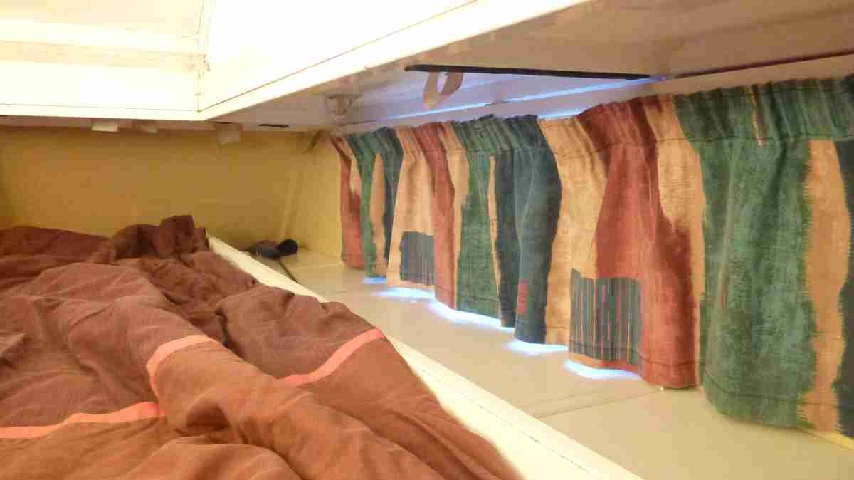 I bought material with a rubber like backing and cut to size needed and my daughter did the sewing for me. I hung on stretchy wire. six years ago now and still look new. Looks homely in the Aluminium TeePee and I tell you that for free.