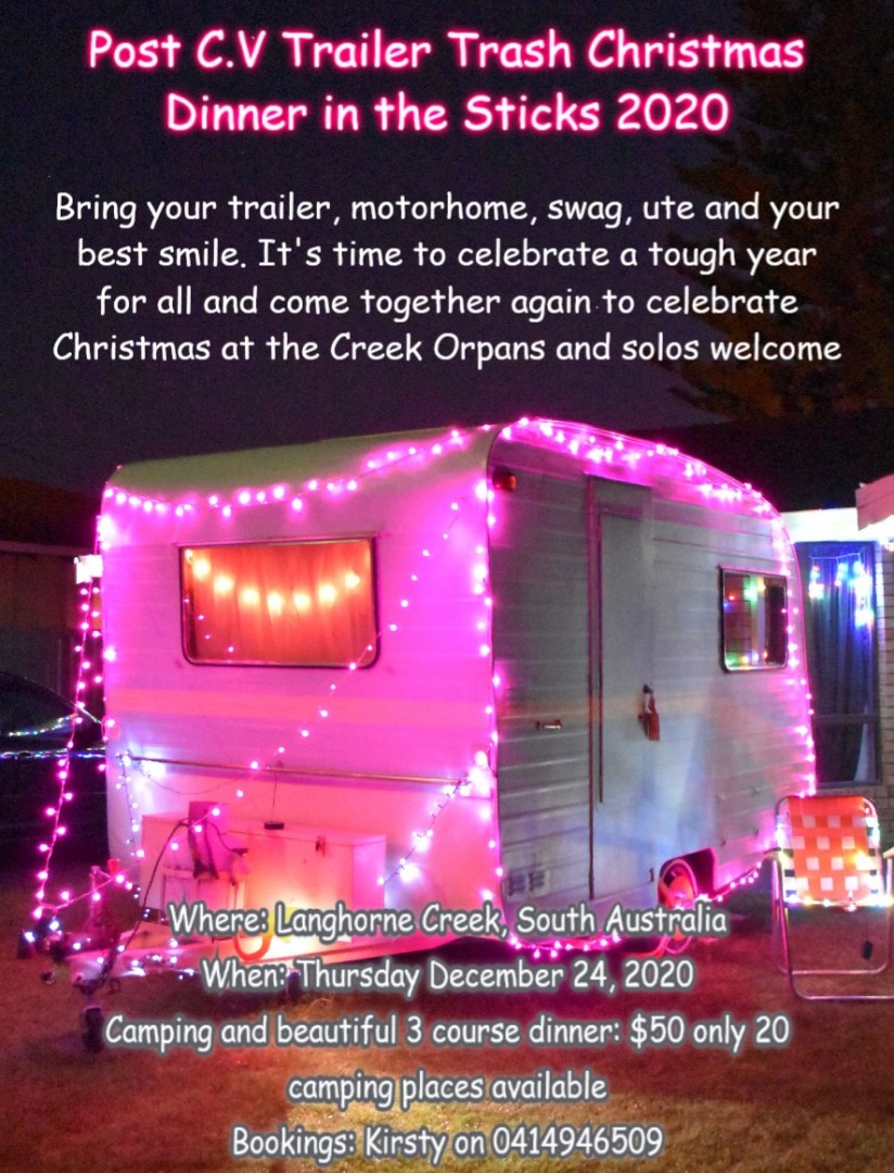 Well don't despair. There is a place for your this year. A classy joint with award winning wines and beautiful sunsets just on the Bremer River 70 ks south of Adelaide. If you are the 3rd wheel, 5th wheel or someone's steering wheel, you are welcome here. We are holding a post covid traveling orphans' trailer trash Christmas dinner party in the vineyard here at Langhorne Creek, South Australia on Thursday December 24th, 2020 at 5.30 p.m. The price includes a gorgeous 3 course dinner with local produce overlooking the vineyard, some star gazing, asteroid showers, hot showers, camping and great company. So book now and join us for some music, singing, great company and celebrate our Christmas 2020. The camping area is near the vineyard so no driving required. ( See pictures). Say goodbye to the tough year we have left behind and let's whoop it up in style. You can stay for 3 days and enjoy the surrounds.
